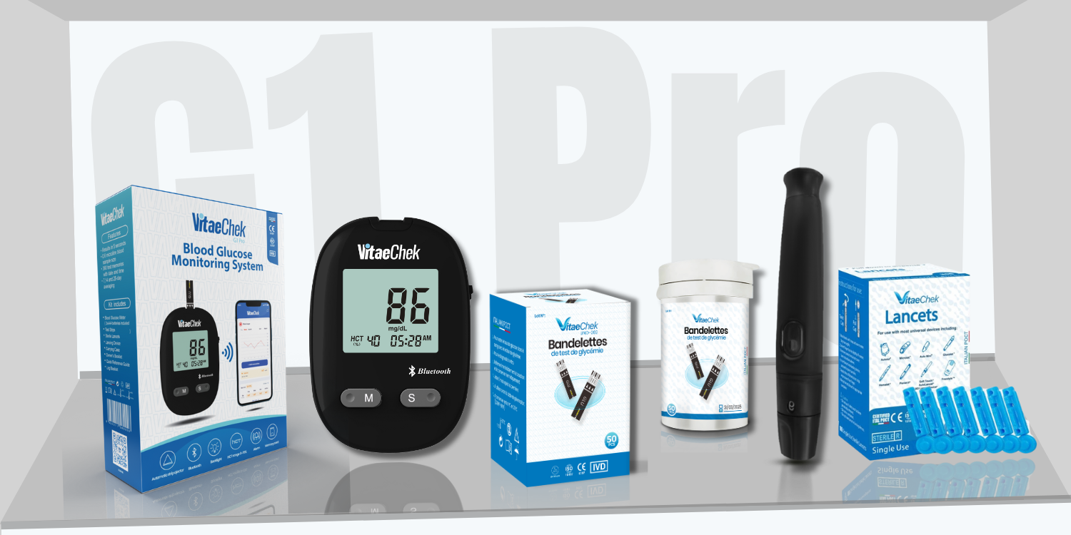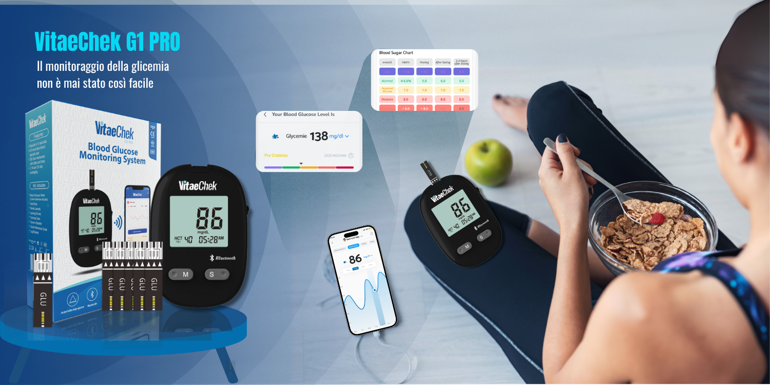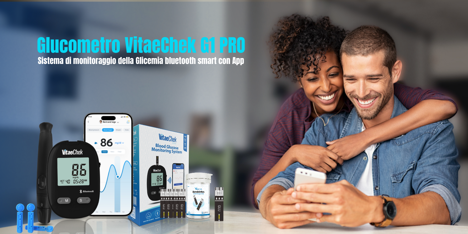 VitaeChek G1 Pro: Glucometro di Precisione intelligente con Bluetooth Misuratore di glicemia con accuratezza grazie al biosensore alla glucosio deidrogenasi e 8 elettrodi.