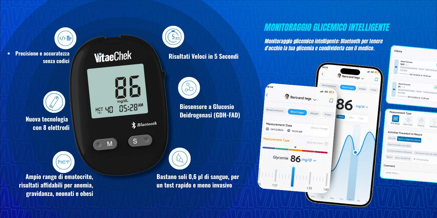 - ✅ TECNOLOGIA GDH AD ALTA PRECISIONE CON SENSORE GLICEMIA AVANZATO : Il misuratore di glicemia VitaeChek G1 Pro utilizza strisce glicemia con biosensore a Glucosio Deidrogenasi (GDH-FAD), riducendo al minimo le interferenze da altre sostanze nel sangue. Ideale per un controllo glicemia affidabile anche in presenza di variazioni ematiche, perfetto per donne in gravidanza, neonati e pazienti con anemia.